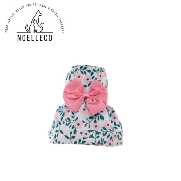 Light weight material dress with a white base, pink flowers and big pink bow on the back.