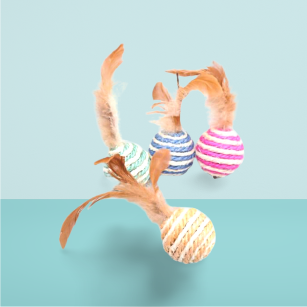 Light weigt colourful rope covered balls with feather facinaters.